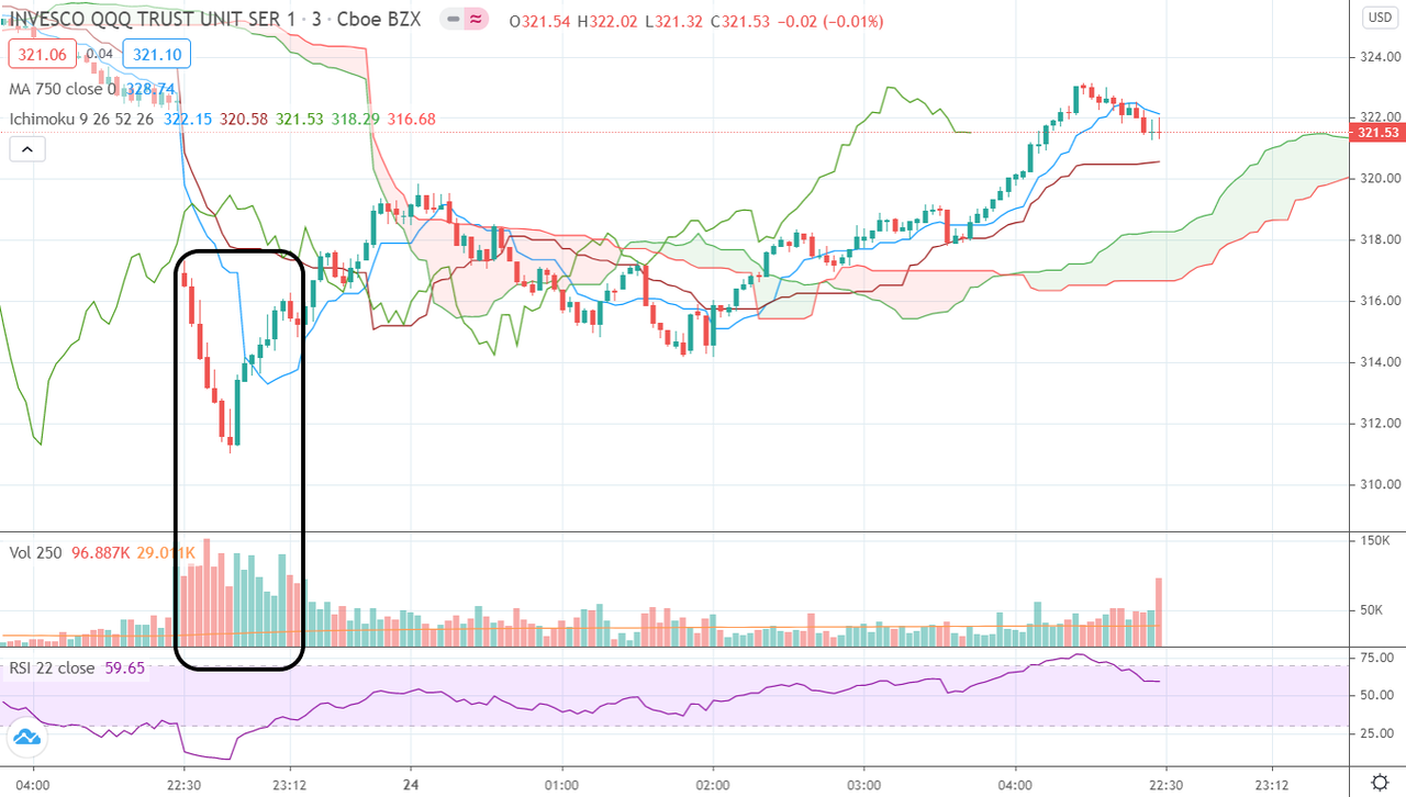 木曜日のQQQを見ると出来高推移は通常時と比べてかなり異常な動きとなった。